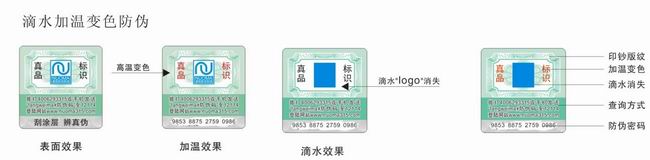 2、手感變色高溫變色防偽——用手就可以檢測(cè)防偽。標(biāo)識(shí)的印制由特殊油墨印制而成,其變色基理為油墨在外界溫度達(dá)到某一溫度區(qū)間內(nèi),油墨內(nèi)部的化學(xué)結(jié)構(gòu)發(fā)生變化,從而使標(biāo)識(shí)呈現(xiàn)出不同顏色。鑒別方法可用手、額頭觸摸標(biāo)識(shí)或輕輕對(duì)著呵一口氣,或使用高溫加熱,標(biāo)識(shí)圖案發(fā)生變化,使用戶馬上鑒別所購(gòu)商品的真假