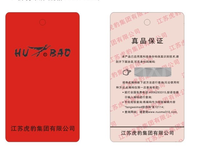 針對服裝、鞋、帽、眼鏡等吊牌適用的商品,將數(shù)碼與吊牌防偽結(jié)合為一體,幫助企業(yè)有效的打擊假冒偽劣商品和解決頭疼的竄貨難題。產(chǎn)品根據(jù)